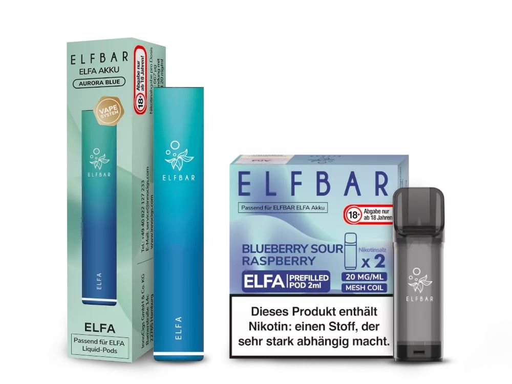 Die ELFBAR Elfa ist eine wiederaufladbare E-Zigarette mit einer Kapazität von 500 mAh. Das Gerät wird mit den wechselbaren Elfa Pods betrieben, welche vor befüllt mit 2 Millilitern Liquid mit einer Nikotinkonzentration von 20 mg/ml geliefert werden. Bei dem hier vorgestellten Produkt handelt es sich um ein Bundle aus einem wiederaufladbaren Akku und zwei vor befüllten Elfa Pods. Beide Komponenten werden in getrennten Verpackungen geliefert. Bezüglich des Akkus haben Sie die Wahl aus sechs verschiedenen Farbvarianten, die ELFBAR Elfa Pods sind in 13 unterschiedlichen Geschmacksrichtungen erhältlich. Die ELFBAR Elfa wird auf Zug am Mundstück aktiviert. Das Gerät kommt ohne Tasten oder sonstige Bedienelemente aus, erfordert keinerlei Einstellungen und kann unmittelbar nach dem Erhalt beider Bestandteile verwendet werden. In Bezug auf Handhabung und Geschmack kann die ELFBAR Elfa mit den Disposables desselben Herstellers verglichen werden, durch die Möglichkeit den Akku erneut zu Laden und den Pod zu Wechseln, können wesentliche Komponenten der E-Zigarette jedoch mehrfach verwendet werden. Über ein separat erhältliches Type C-USB-Kabel kann der Akku beschleunigt und optimiert mit frischer Energie versorgt werden. Die Verbindung der Elfa Pods mit dem Housing des Akkus erfolgt durch einfaches Zusammenstecken.